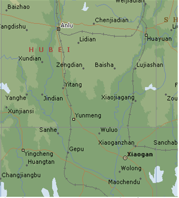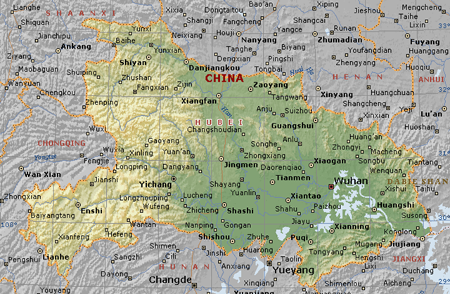 It was a pity that darkness was closing in after we travelled on the expressway around 2 hours. I kept an eye out for where the Jianghan Plain ends and the hills and mountains begin. Around Anlu, a town on the way, the plain gradually gave way to low hills. As the coach was gliding along, the plain was left behind and massive hills and mountains came into sight. It was a sharp contrast between the two terrains. It was a wonderful experience to see a dot of highland rising in the distance, growing larger and taller little by little and turning finally into an immense mountain range. Later I consulted a map of Hubei and it proved that my observation was right. (See the map below.)