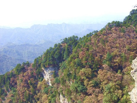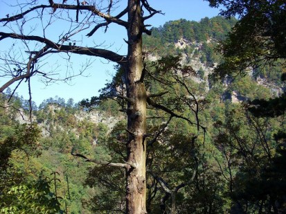 We took the path we had missed the day before. The downward way was rough but rich in postcard scenery. The trail was not maintained at all. Instead, it was beaten by trekkers who had ventured there. The virgin forests were dense and vines everywhere. Some trees, dead from old age, lay where they had fallen, rotten. It was shady and cool all the way although early May is not when vegetation is the lushest in this part of China.