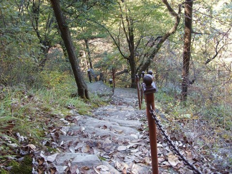 The upward hike was very difficult at two places where the trail was precipitous. The footpath roughly paved with rocks, there were no protective railings or chains on either side for us to hold onto. During the course of the climb, I kept reminding my daughter to cling onto my jacket, for she was still giggling and chattering all along. She was too young to perceive how risky the crawl was. I had to grip the stones with one hand. Meanwhile, I had to balance my daughter on the back with the other.