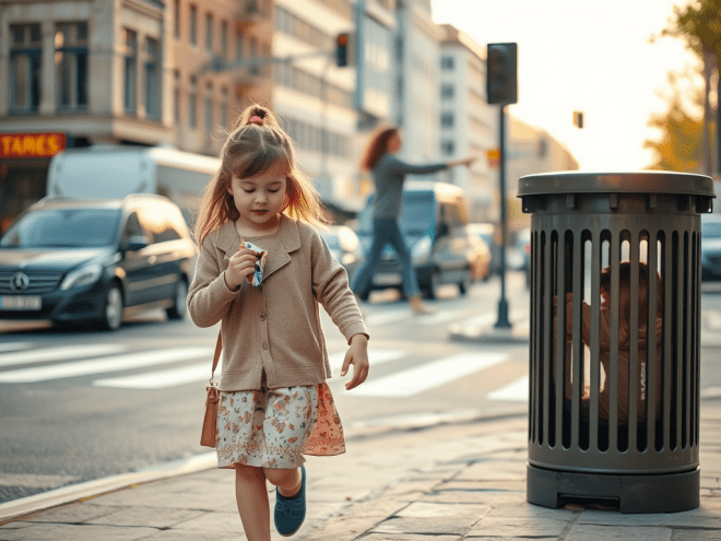 The girl, about 8, was snacking when walking. Upon finishing the treat, she casually dropped the wrapping on the pavement. When the mother saw it, she bent over and talked to the girl. Her voice was so gentle that I could not hear her clearly. After the mother straightened up, the girl looked around as if to search for something. It seemed that she could not find it. Then the kid turned to her mother, who in turn pointed her toward something on the other side of the street. It was a bin.