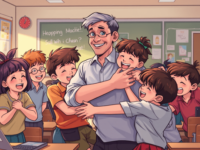 At first, none of us, confused and scared, dared to accept his enthusiastic gesture. Then the president of our class took the lead in hugging our teacher. Everyone else in our class followed suit. When the bell went off announcing the end of the period, the master got emotional, exclaiming that our company was his greatest joy.