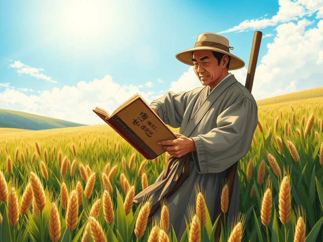 My best memory of Quanlaotour is as follows. On many a spring day, either in the morning or in the afternoon, when the sun was nice and warm, he was tending his wheat crop, hoeing or weeding or fertilising. When he was tired, he would stop and rest himself against the hoe, standing right in the middle of the field. A book was magically produced from under his baggy robe. Then and there, he was reading, sometimes aloud, most times silently. What a picture! All the quiet, all the fresh verdure, all the warm breeze, a Chinese peasant who lost himself in a book, basking in the sun. Occasionally I found him waving his arms in the air.