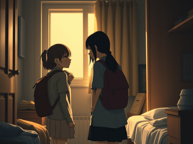 Inside the dorm, the two girls sat down and stayed silent for a while. Jingxin had to go home, for her parents were waiting for her. It was hard to tell it to Fei, though.