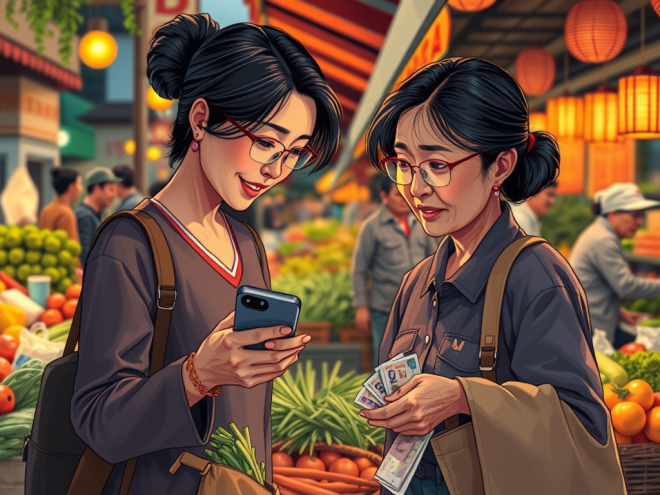 Mother uses her phone to pay for her shopping, too. These days, however, she carries some coins and banknotes in her purse. Every evening after school, Mother comes and picks me up. On the way home, we often come across some old farmers peddling fresh vegetables, most of whom do not use a smartphone trading. Mother’s cash will come to her rescue when she buys vegetables from these elderly veg sellers.