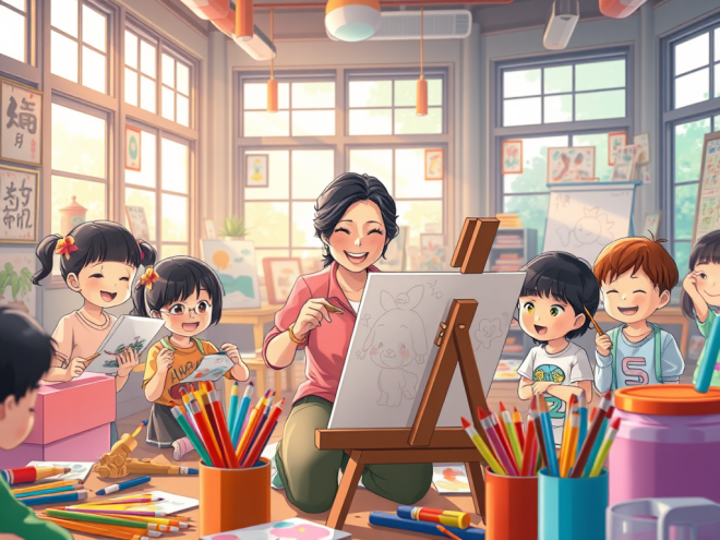 Next to the piano room is an art room, where at the time over 20 kids ages 5 to 12 were taking a drawing lesson. To my perplexity, seated among the kids was a middle-aged lady, who was working away at an easel on a picture too. She was not the tutor, though.