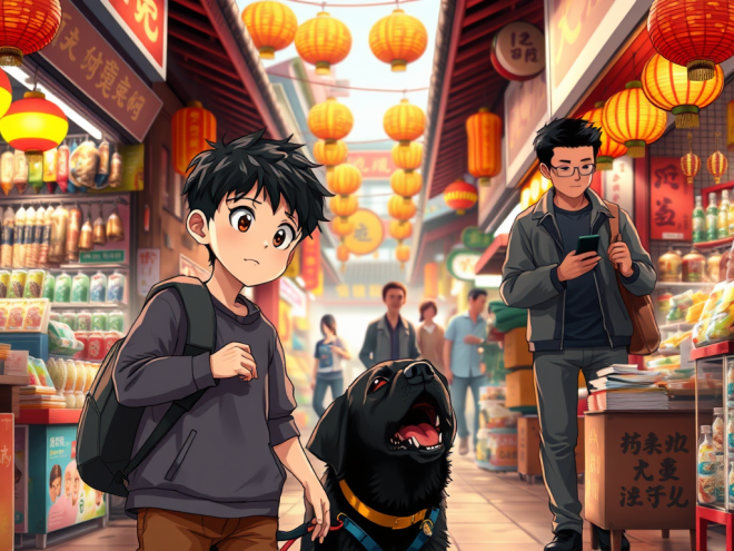 One day, I was walking the dog with my mother. We passed by a park and a school before we stopped by at a street market, where we needed to get some necessities. Between the rows of stalls, there were such hordes of shoppers at the time that several guys even bumped into me. All of a sudden, my dog Black started to bark. Woof! Woof! While baying fiercely, he ran up to a man in front and seized him by the trouser leg.