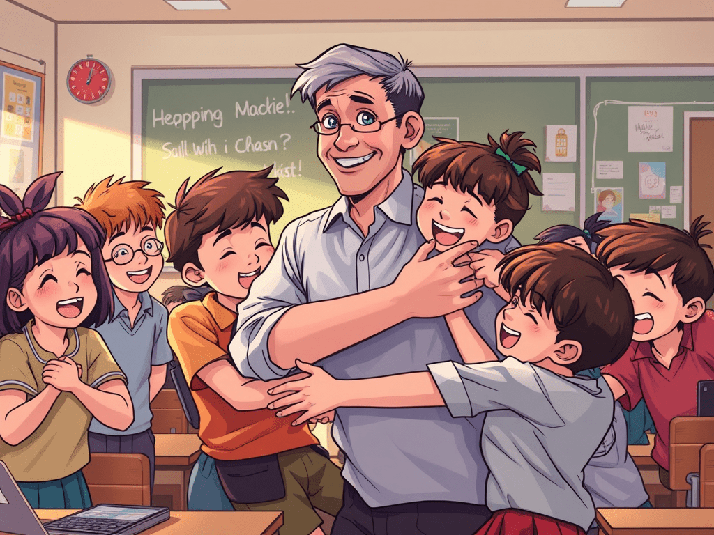 At first, none of us, confused and scared, dared to accept his enthusiastic gesture. Then the class president took the lead in hugging our teacher. Everyone else in our class followed suit. The moment the dismissal bell went off, the master got emotional, exclaiming that our company was his greatest joy.