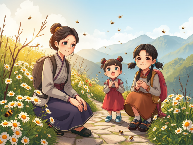 It was springtime, flowers and blossoms everywhere along the path. Bees, wild and domesticated, were busy with their work. On their ascent up to the summit, the younger daughter got tired so easily that she had to take breaks from time to time.