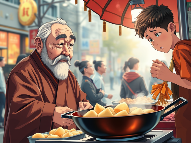 One morning, as Grandad was strolling down the street, a young food vendor, who was busy frying youtiao, caught his eye. He went over and fixed his eyes on the guy working at the food cart on the pavement. All of a sudden, Grandad blurted out, “Guy, your dough is too wet. It is not good for frying. And look at your hands. You take cash from your customers with them. Meanwhile you use the same hands to knead the dough.”